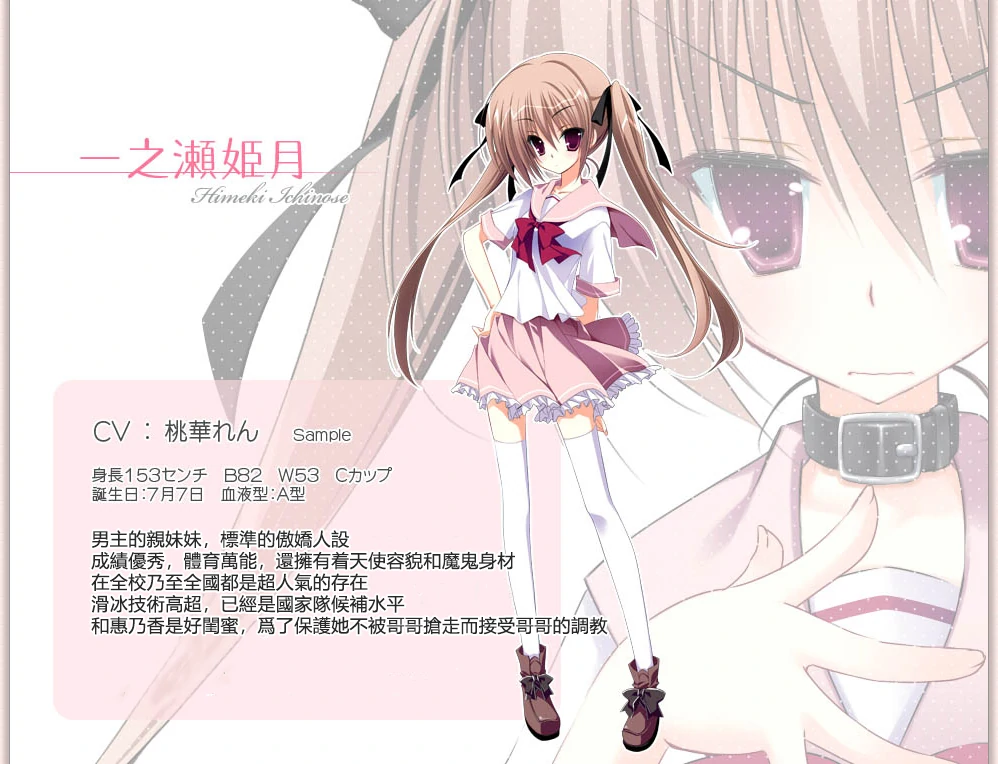 男主一之瀨誠是個日本阿宅作品中的標準男主角:有房有妹,父母爽盲不在家,零花錢給夠,整日沉迷工口遊戲的大學生。而他的妹妹姬月同樣也是經典的學習體育無敵,校內人氣王的無敵美少女人設。妹妹因爲小時候的某件事深愛着哥哥,是個超級兄控,但因爲男主沉迷hgame整日擺爛,妹妹恨鐵不成鋼每日都對男主進行人身攻擊。(但還是照顧哥哥的起居,做好愛妻便當)