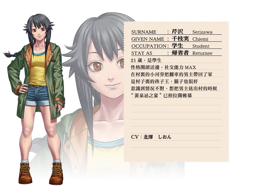 也不知過了多久終於來到小溪盡頭,被路過的女大學生芹澤 千枝實幫助帶回宿舍暫住一晚,芹澤爲人開朗大方,熱情招待了男主后便答應次日送其到鎮上可以回家。