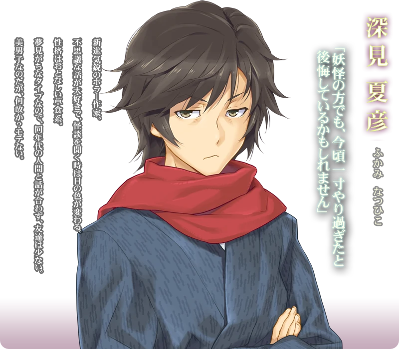 近期躥紅的驚悚小説作家,非常喜歡各種怪談,爲了取材再次來到了這家溫泉旅館,對蓮華一見鍾情。