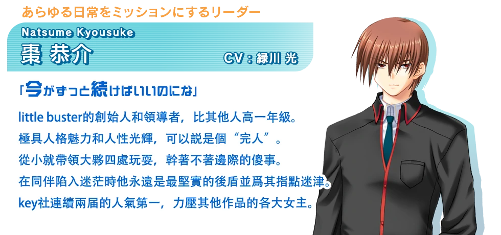 《Little Busters!》是麻枝准、樋上至、都乃河勇人、Na-Ga等Key社元老級主創陣容最後一次大規模合作,也被譽爲麻枝准創作生涯的最後巔峰。作品突破了以往Galgame偏重戀愛主綫的局限,向世人證明:友情,同樣能夠構築起足以打動人心的情感核心。