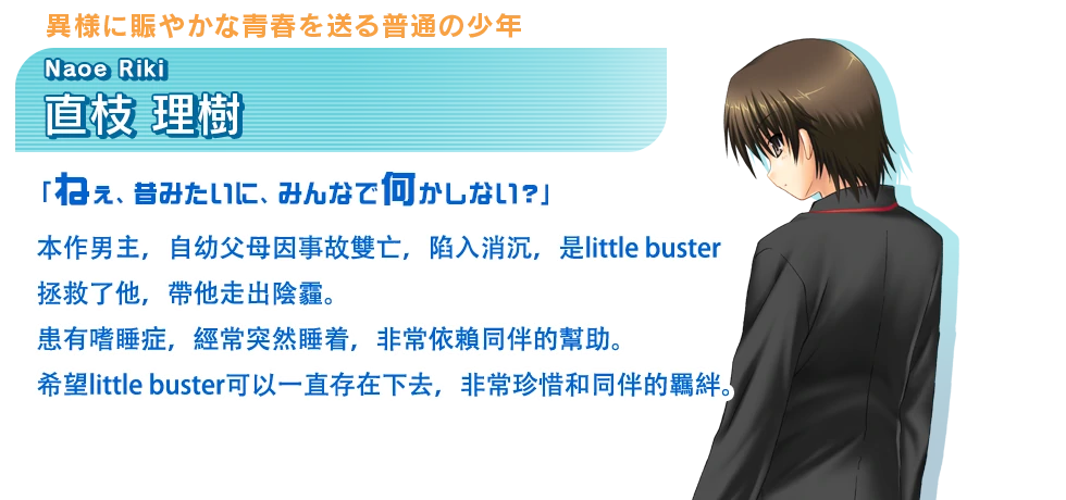 男主直枝理樹自幼父母雙亡,陷入自閉狀態,每日被失去至親的痛苦所折磨。四個自稱Little Buster(以下簡稱LB)的孩子:棗恭介、棗鈴、井之原真人、宮澤謙吾出現在他的生活中。他們聲稱世界即將毀滅,必須借助理樹的力量才能拯救世界,以此爲由將理樹拉入了他們的小團體。五人每天都做著天馬行空的傻事,快樂地玩耍,理樹也因此走出陰霾,重新回歸正常生活。