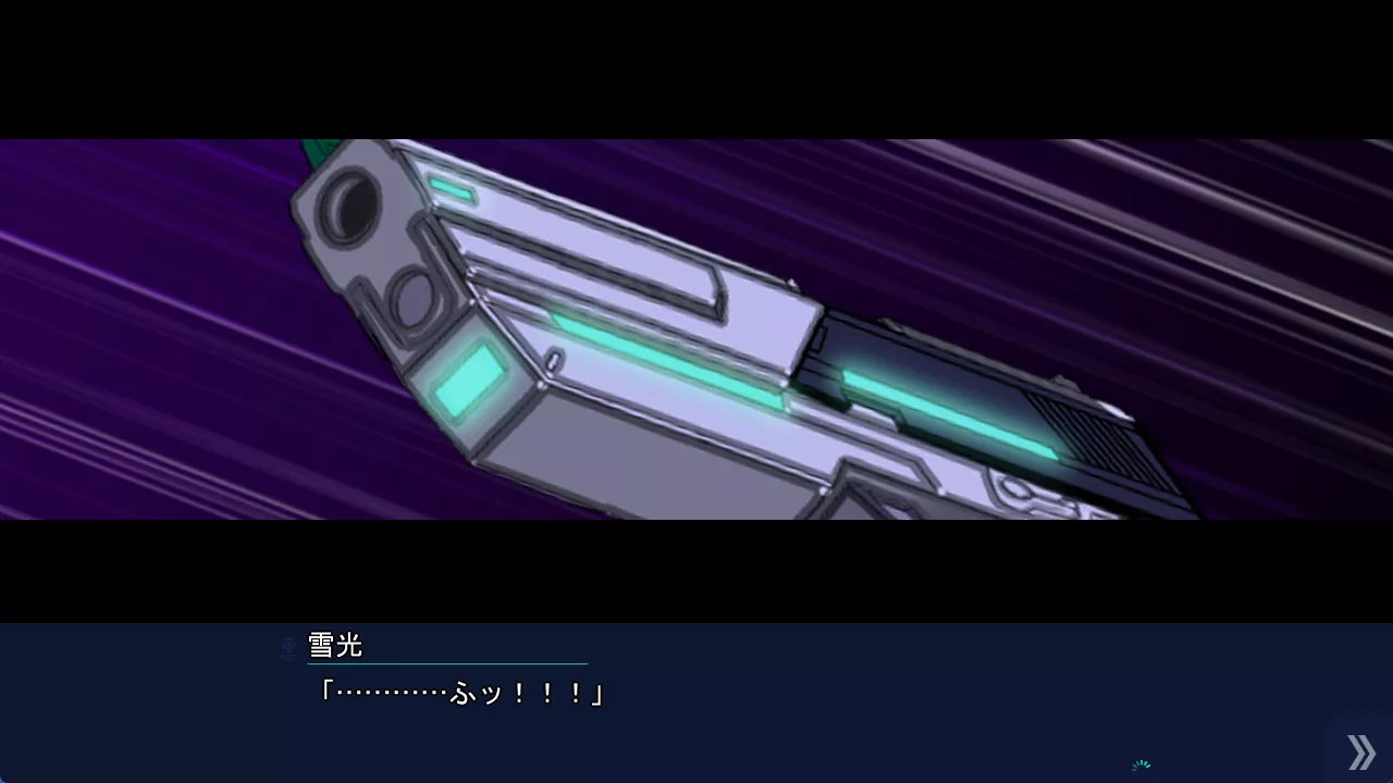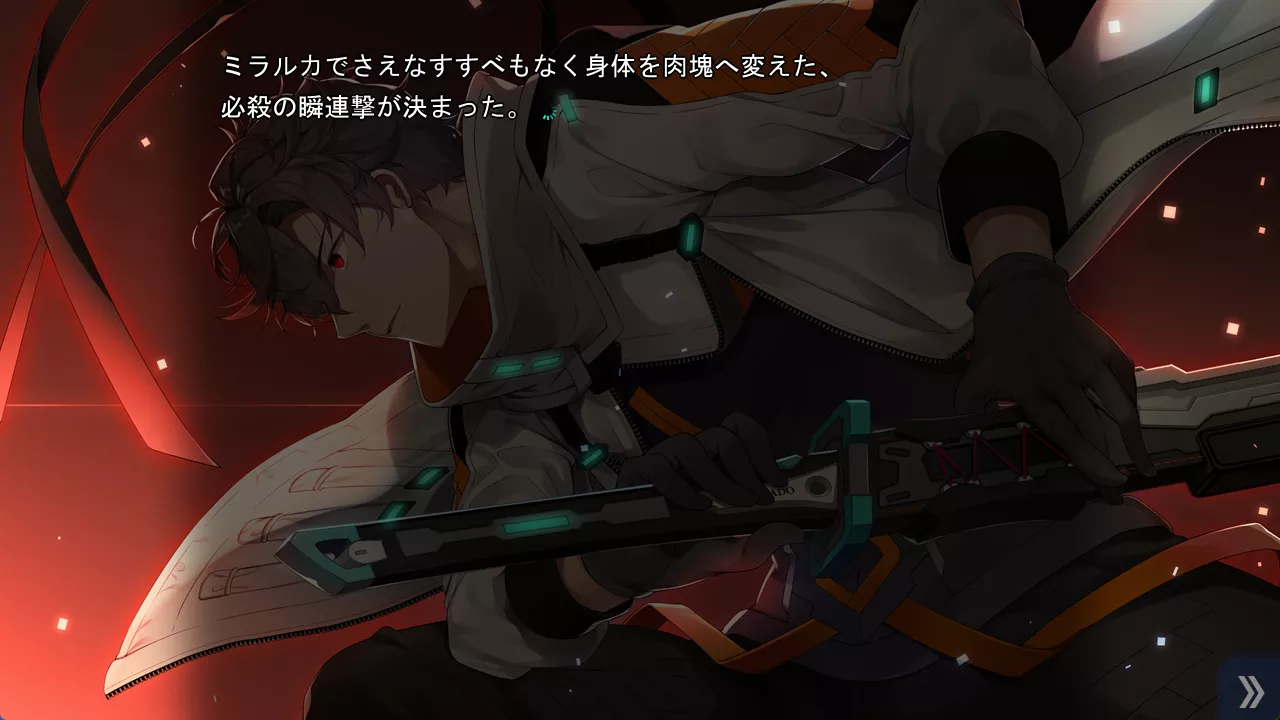 要想俘獲女主角的芳心,那麼就肯定不能缺少戰鬥和裝逼場景。光是說男主角多強多屌而不展現出來無疑是空洞的。Galgame 不像 3A 遊戲,沒法用炫酷的實時特效渲染戰鬥場面,但好在 CRYSTALiA 是這方面的專家,本作中他們巧妙地用區區幾幀的特效圖案、武器插圖和人物動作立繪進行排列組合,配上文字描寫和音效,居然就在 Galgame 裏面展現出了栩栩如生的戰鬥場面,準確地說,是在玩家的腦海裏形成了栩栩如生的戰鬥場面,總之看上去沒有絲毫違和感。這一點是其他的 Galgame 公司望塵莫及的。